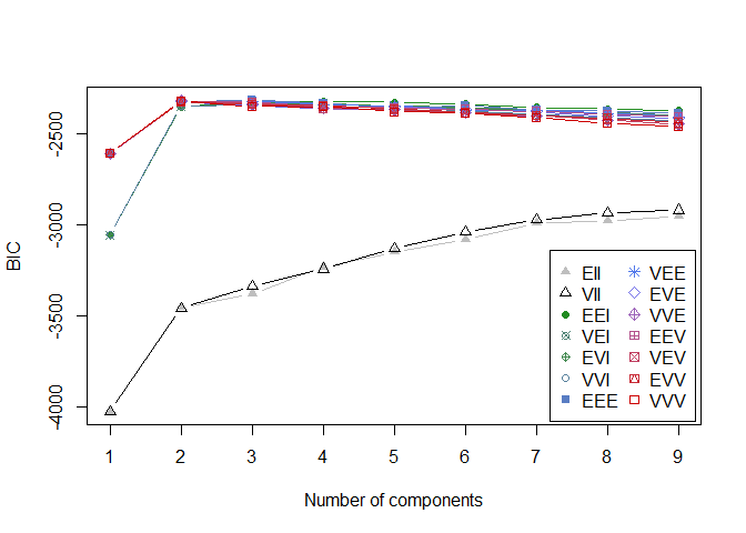 model_mclust = Mclust(sim_matrix[,-3]) #the [,-3] slicing corresponds to all the columns except the last one (which is the label column).