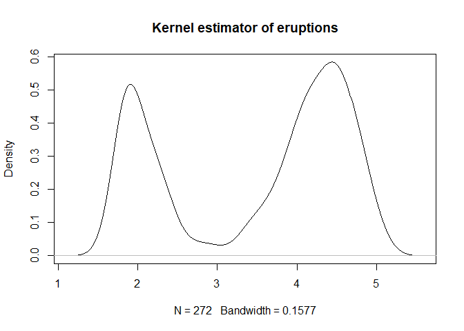 plot(density(faithful[, 1], bw = bw.bcv(faithful[,1])), main="Kernel estimator of eruptions")