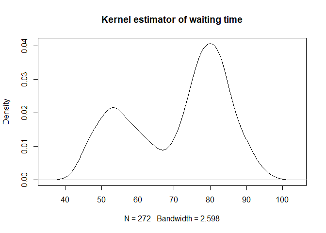 plot(density(faithful[, 2], bw = bw.bcv(faithful[, 2])), main="Kernel estimator of waiting time")