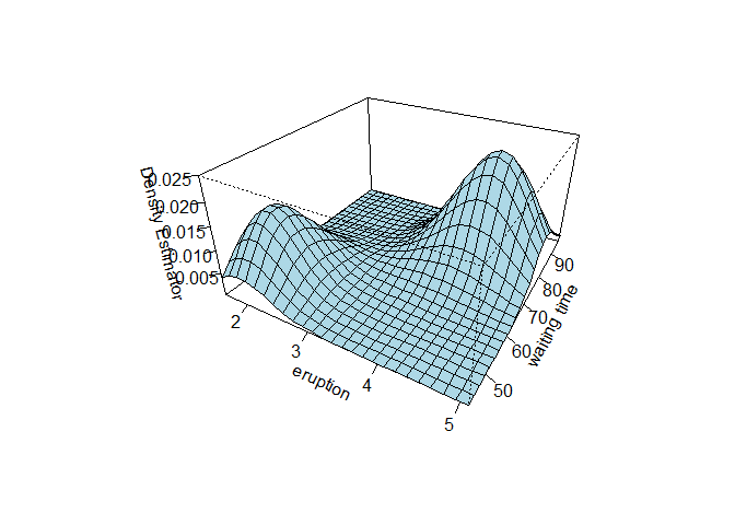 ticktype="detailed", xlab="eruption", ylab="waiting time", zlab="Density Estimator")