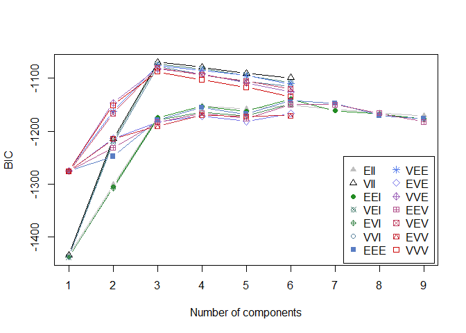Let’s head straight to using Mclust and plot the BIC indicator :