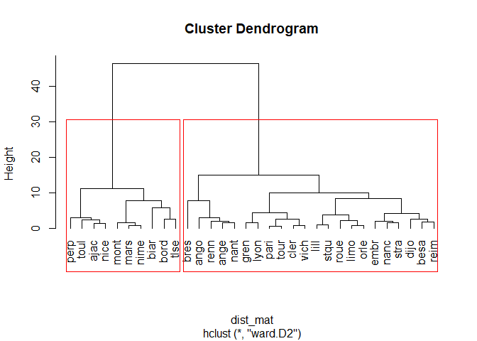 Here we can see that there are two main groups of cities that are classified using the HAC method : the northern cities and the southern cities of france. Which is logical since the temperature difference are important. Now let’s draw out the groups of cities on the dendrogram